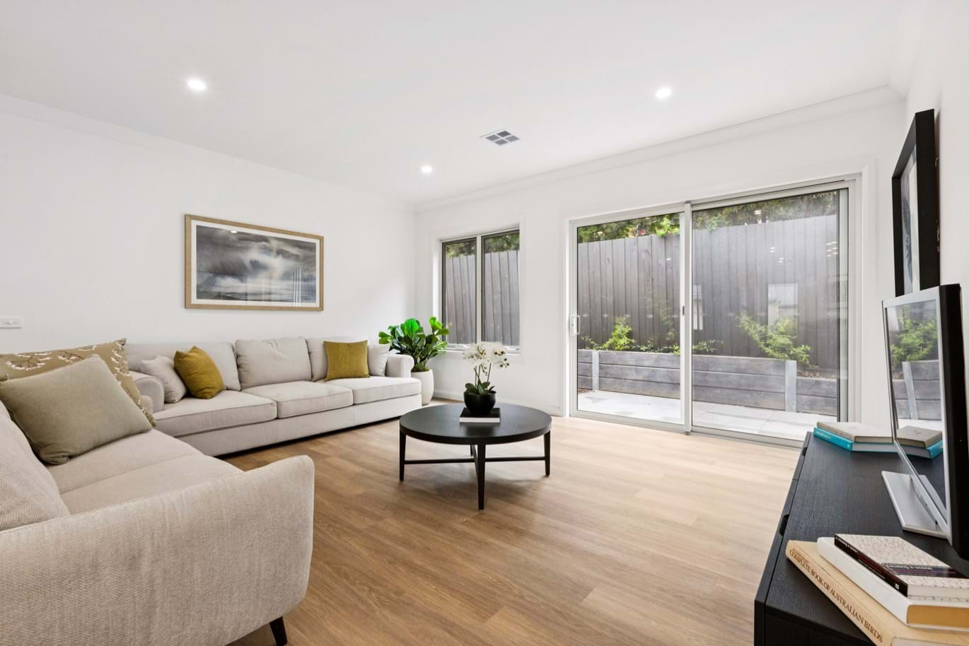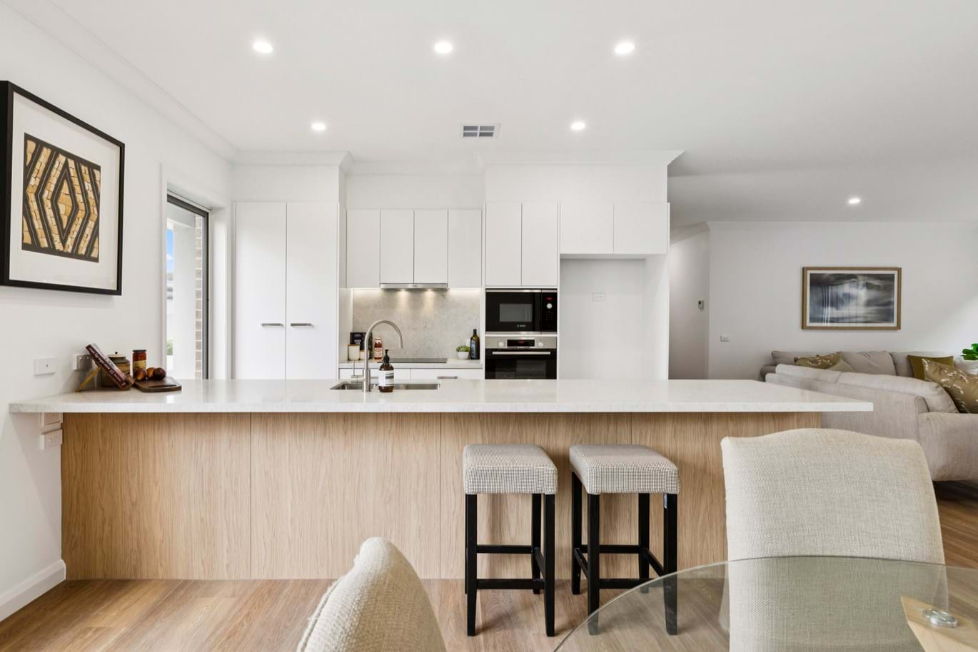 The modern kitchen in the heart of the residence, boasts exquisite stone benchtops and splash backs, complemented by top-of-the-line Bosch stainless steel appliances, including a wall oven, cooktop, rangehood, dishwasher, and microwave. The open-plan living area flows seamlessly, creating an ideal space for both intimate gatherings and entertaining.