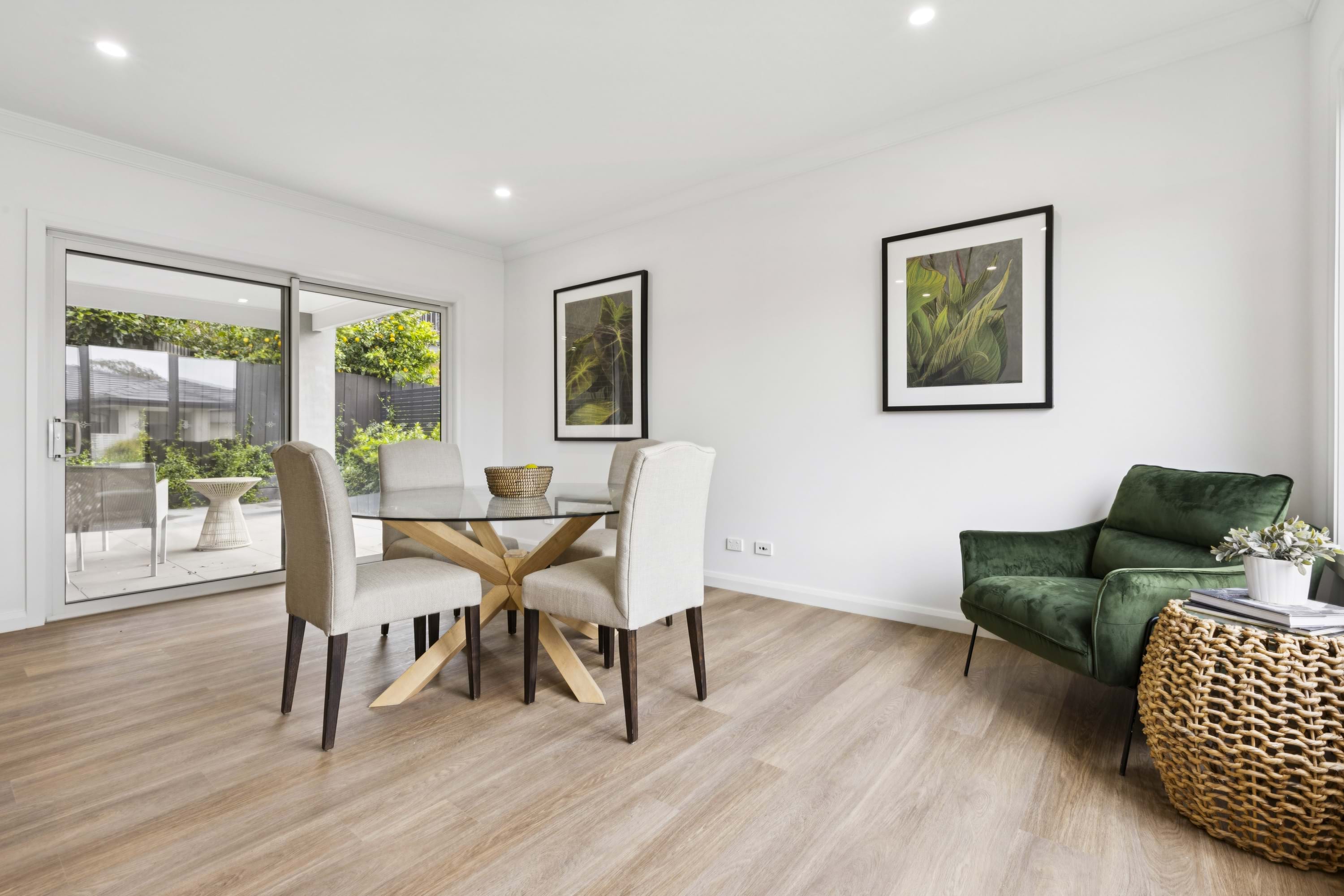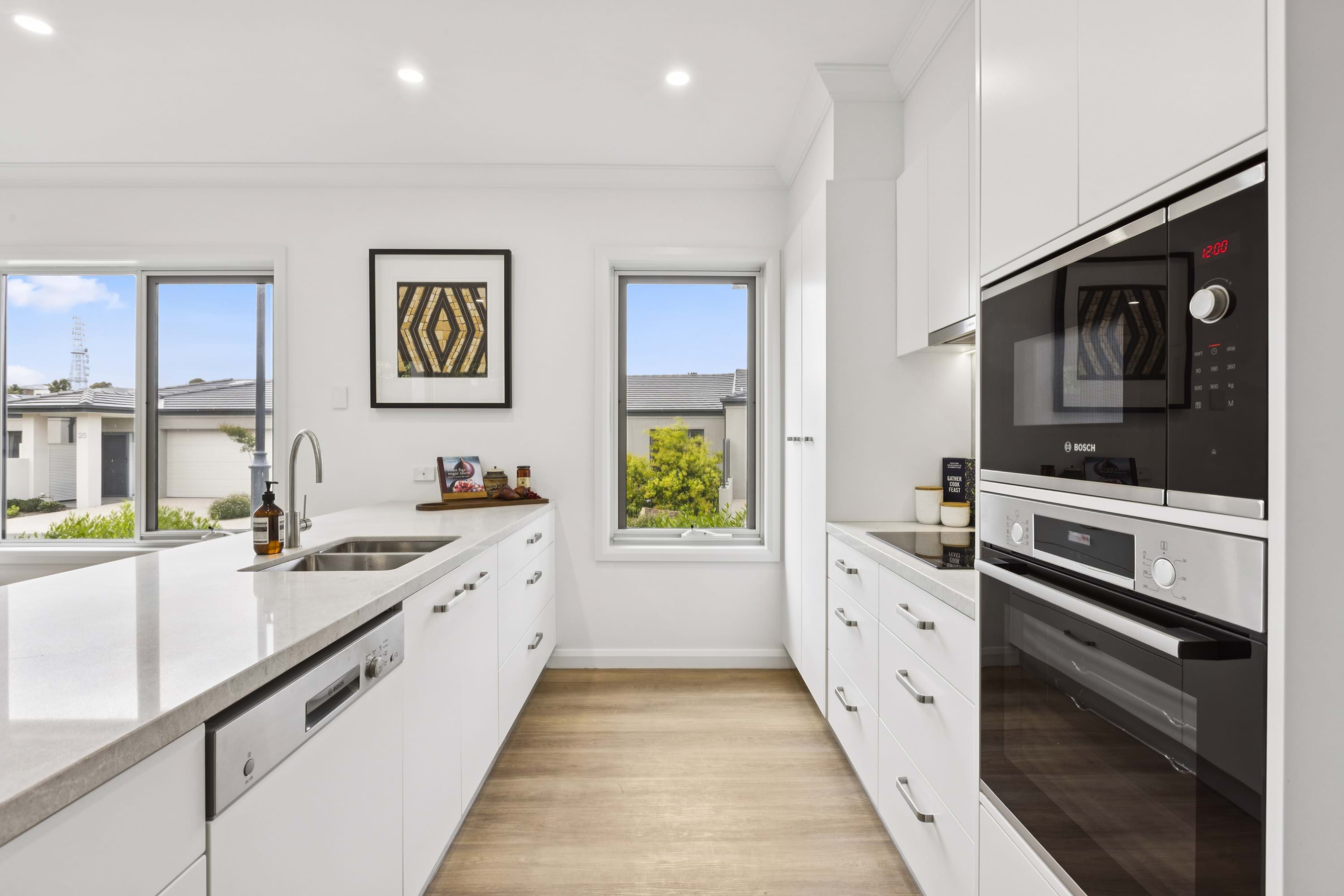 The modern kitchen in the heart of the residence, boasts exquisite stone benchtops and splash backs, complemented by top-of-the-line Bosch stainless steel appliances, including a wall oven, cooktop, rangehood, dishwasher, and microwave. The open-plan living area flows seamlessly, creating an ideal space for both intimate gatherings and entertaining.