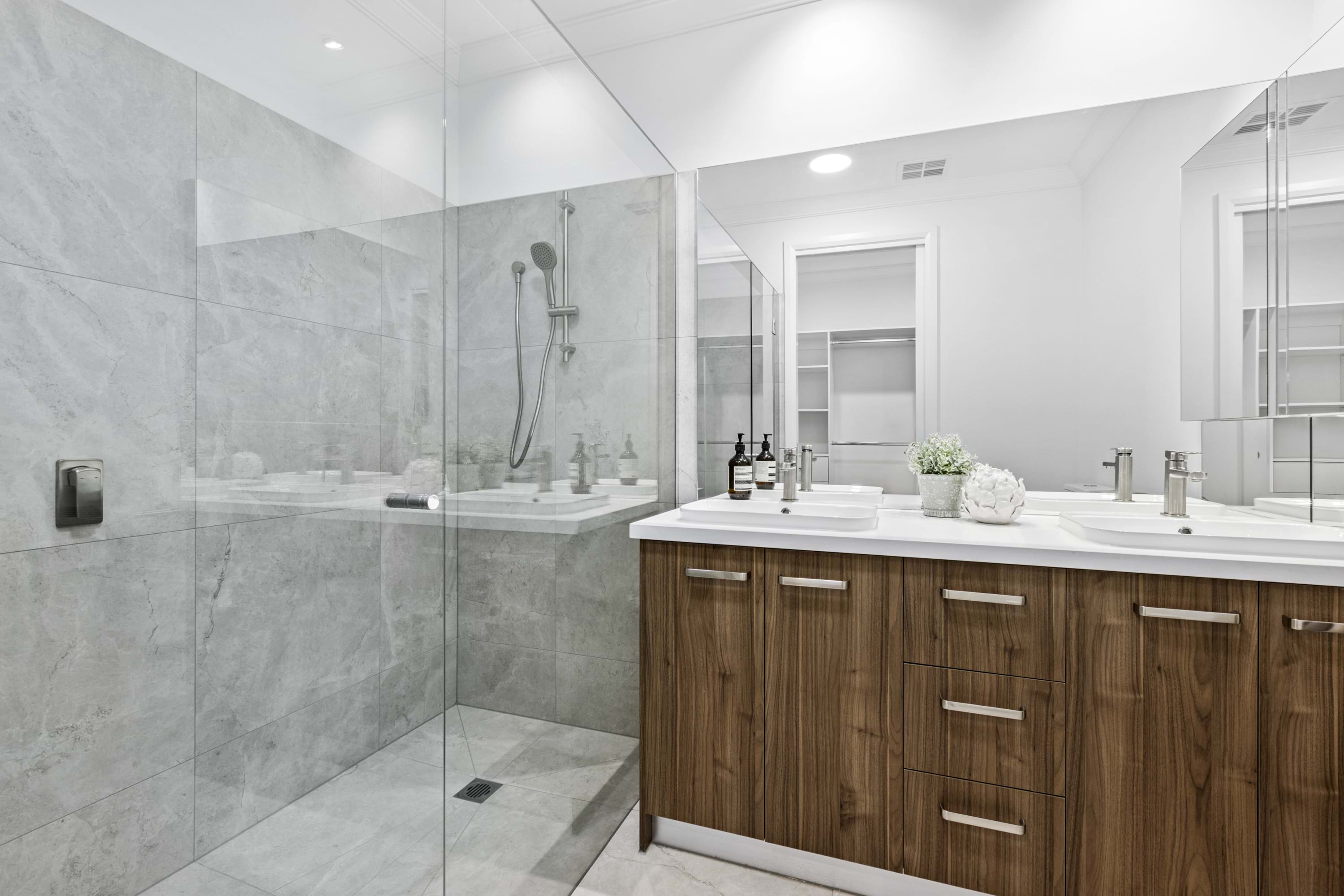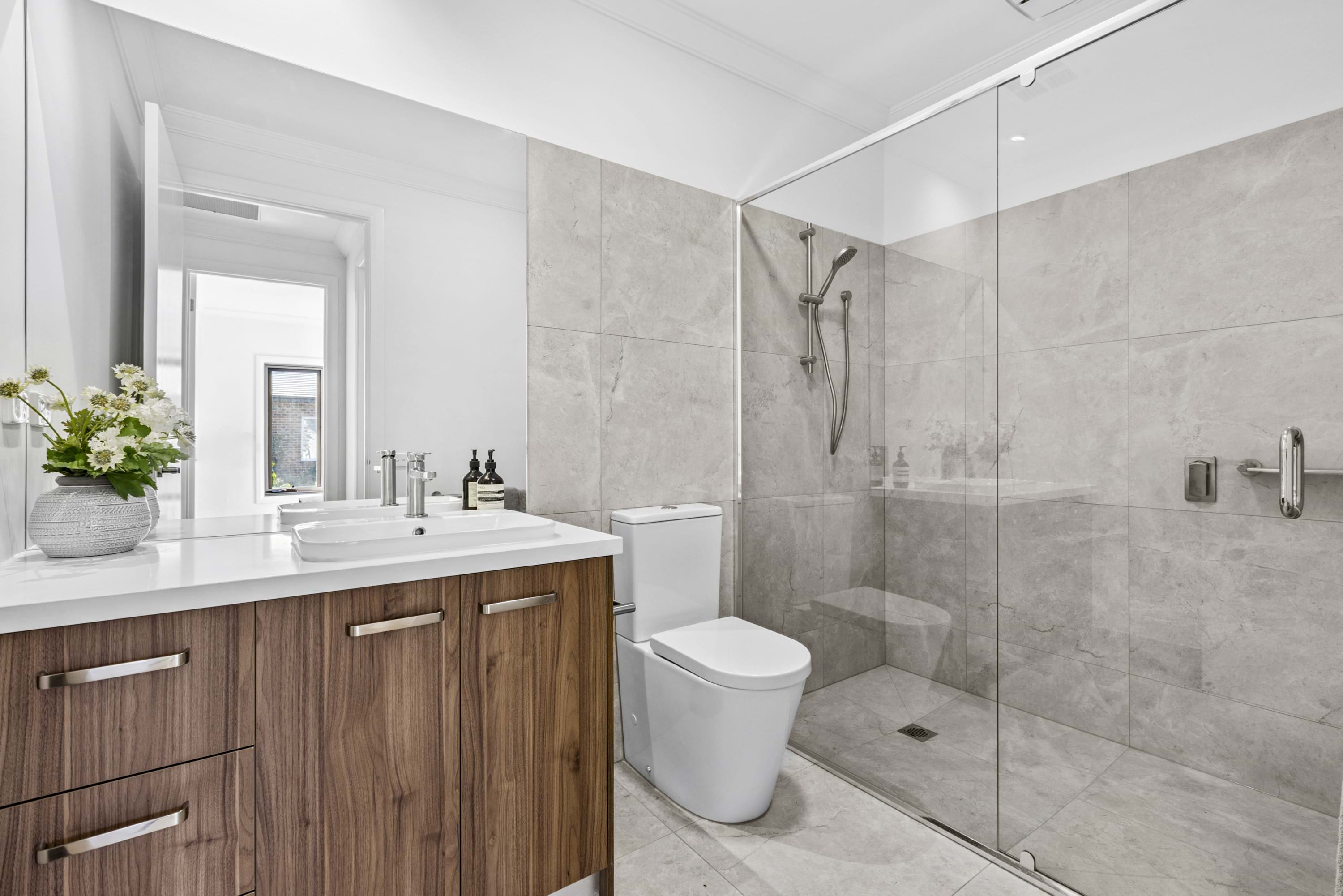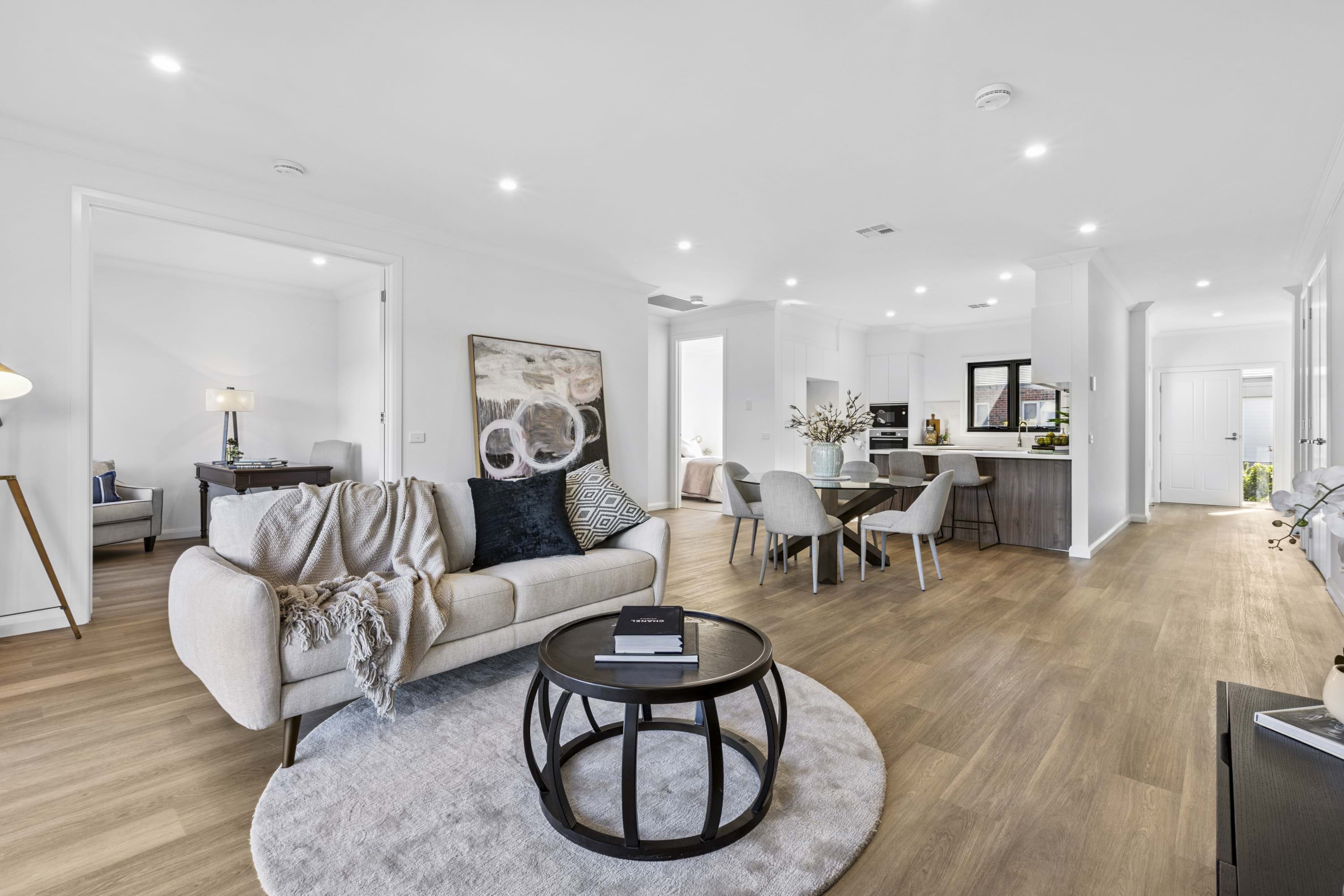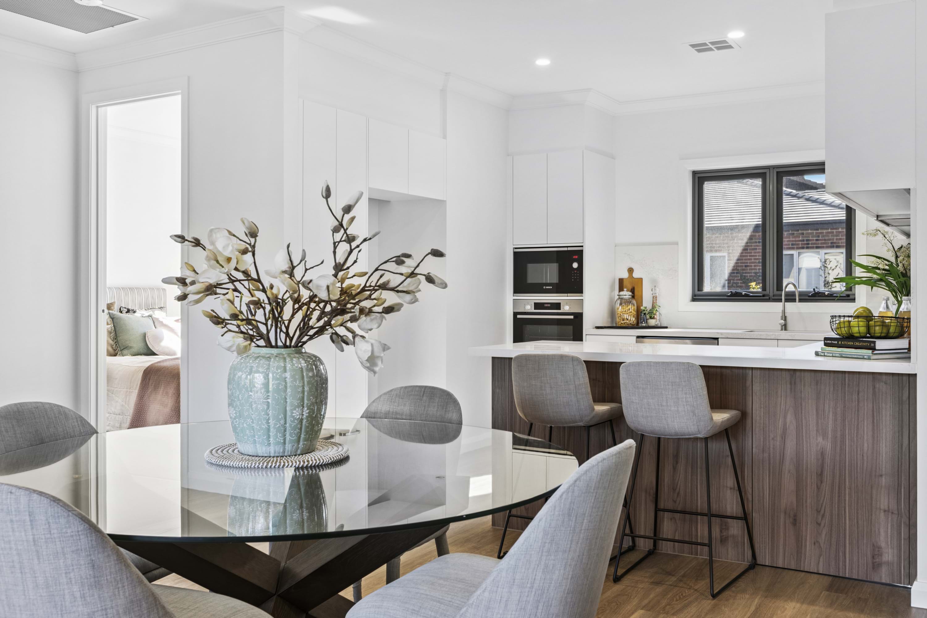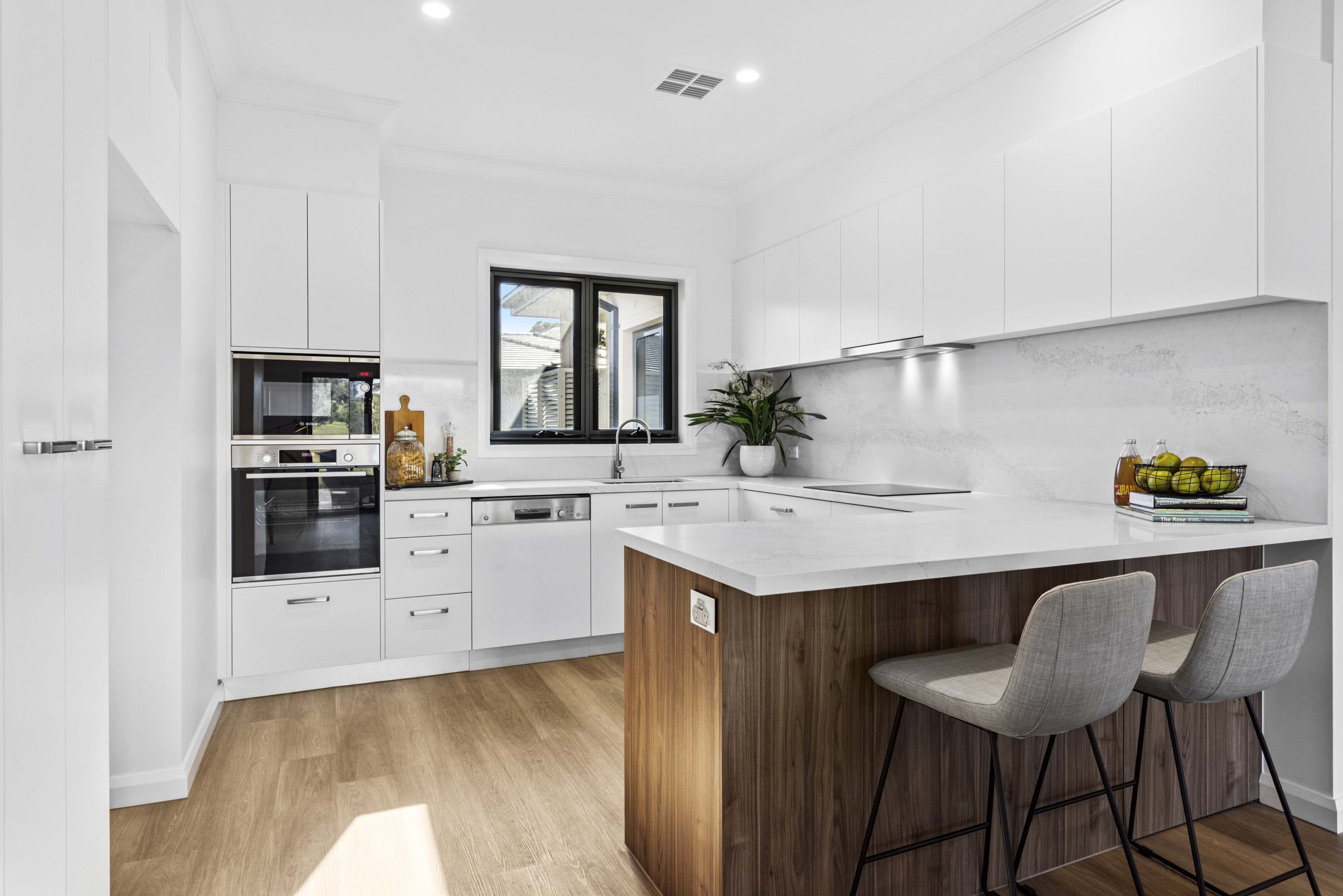 The modern kitchen in the heart of the residence, boasts exquisite stone benchtops and splash backs, complemented by top-of-the-line Bosch stainless steel appliances, including a wall oven, cooktop, rangehood, dishwasher, and microwave. The open-plan living area flows seamlessly, creating an ideal space for both intimate gatherings and grand entertaining.